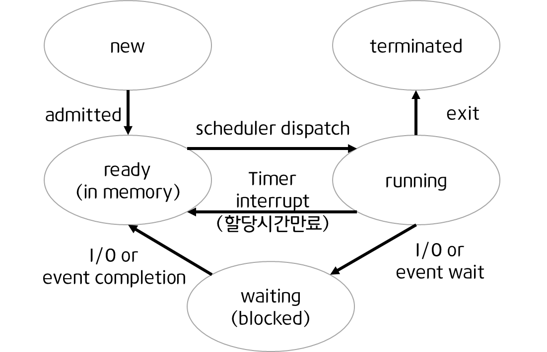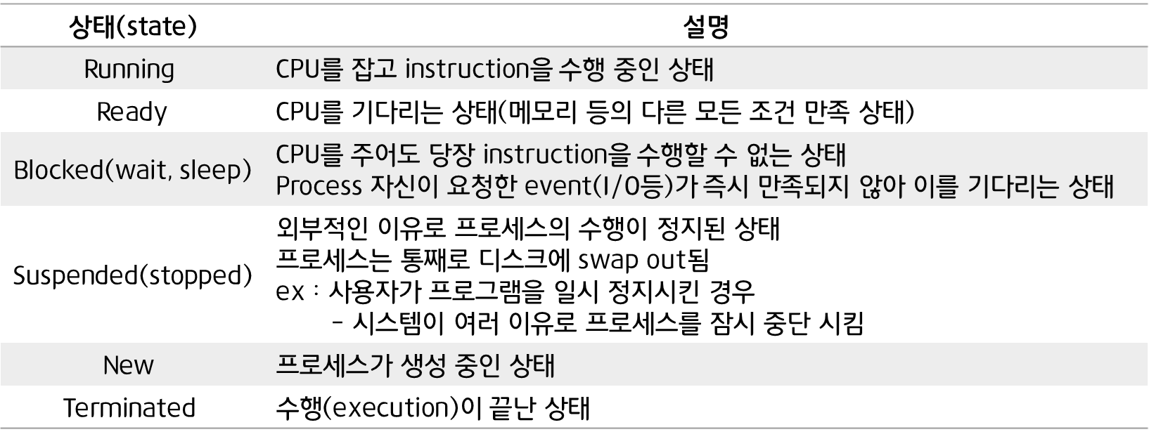 이후 중기 스케줄러로 인해 Suspended가 추가됨( *중기 스케줄러는 밑에서 설명)