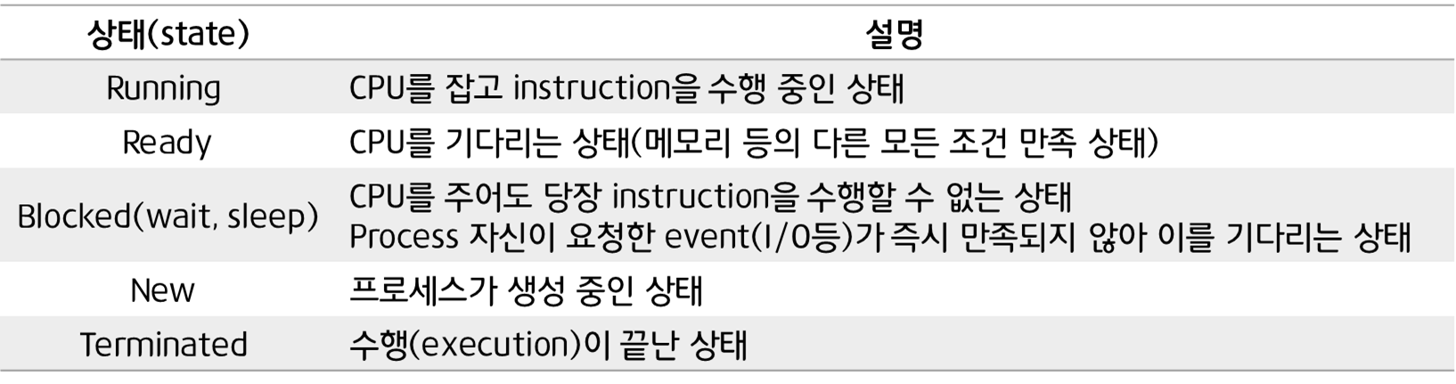 - CPU 수행 상태를 나타내는 하드웨어 문맥 : Program Counter, 각종 register(instruction check)