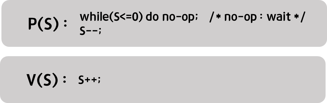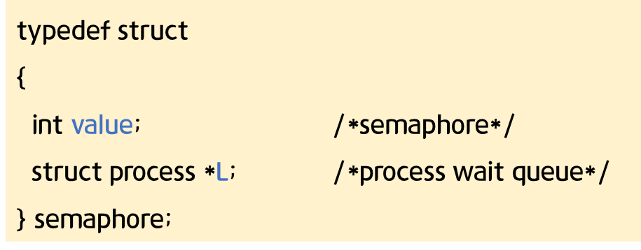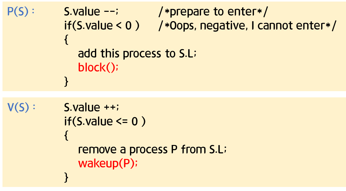- Semaphore 연산이 다음과 같이 정의됨.