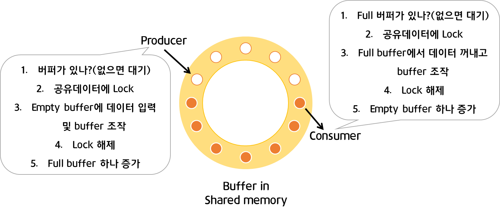 - buffer 자체 및 buffer 조작 변수(empty/full buffer의 시작 위치)