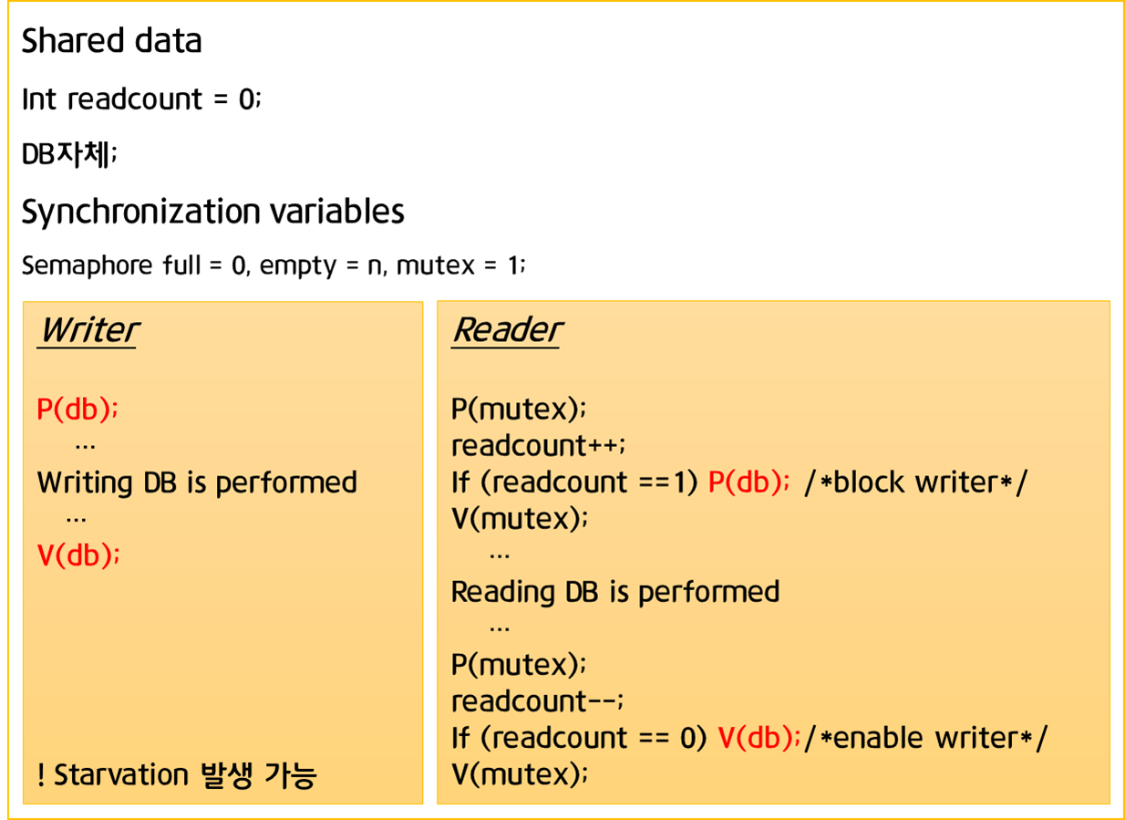 - Writer가 DB에 접근 허가를 아직 얻지 못한 상태에서는 모든 대기중인 Reader들을 다 DB에 접근하게 해준다.