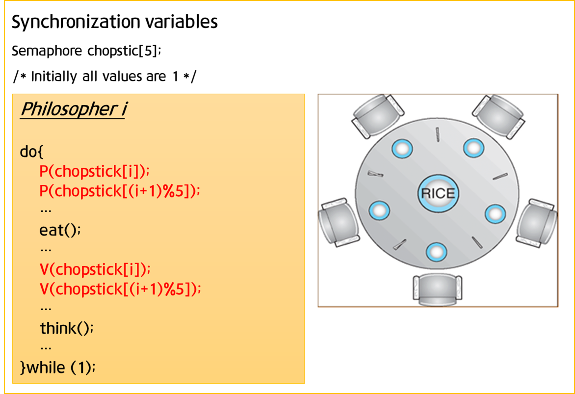 - Deadlock 가능성이 있다(모든 철학자가 배가 고파져 왼쪽 젓가락을 집어버린 경우)