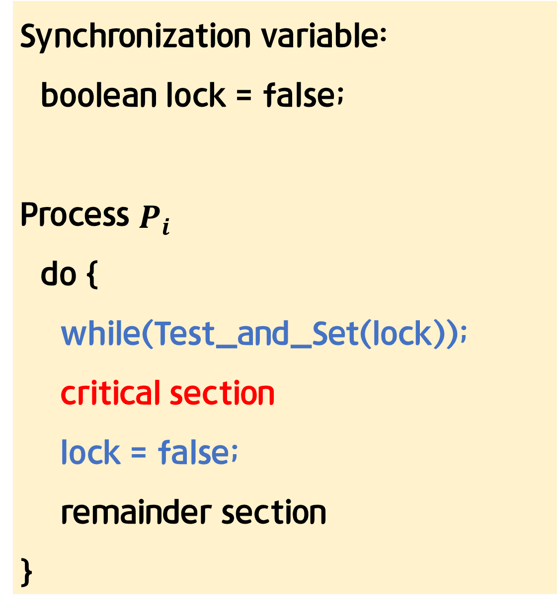 - 하드웨어적으로 Test&Modify를 atomic하게 수행할 수 있도록 지원하는 경우 앞의 문제는 간단하게 해결 가능하다.
