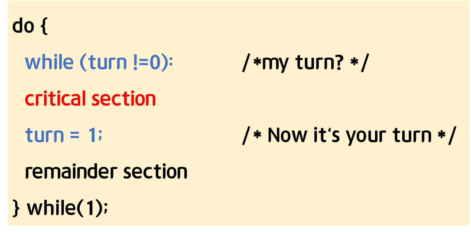 1번 프로세스에서 0으로 바뀌면 그 때 critical section으로 들어가고, 후에 turn을 1로 바꿔서 프로세스1에게 상태를 넘김.