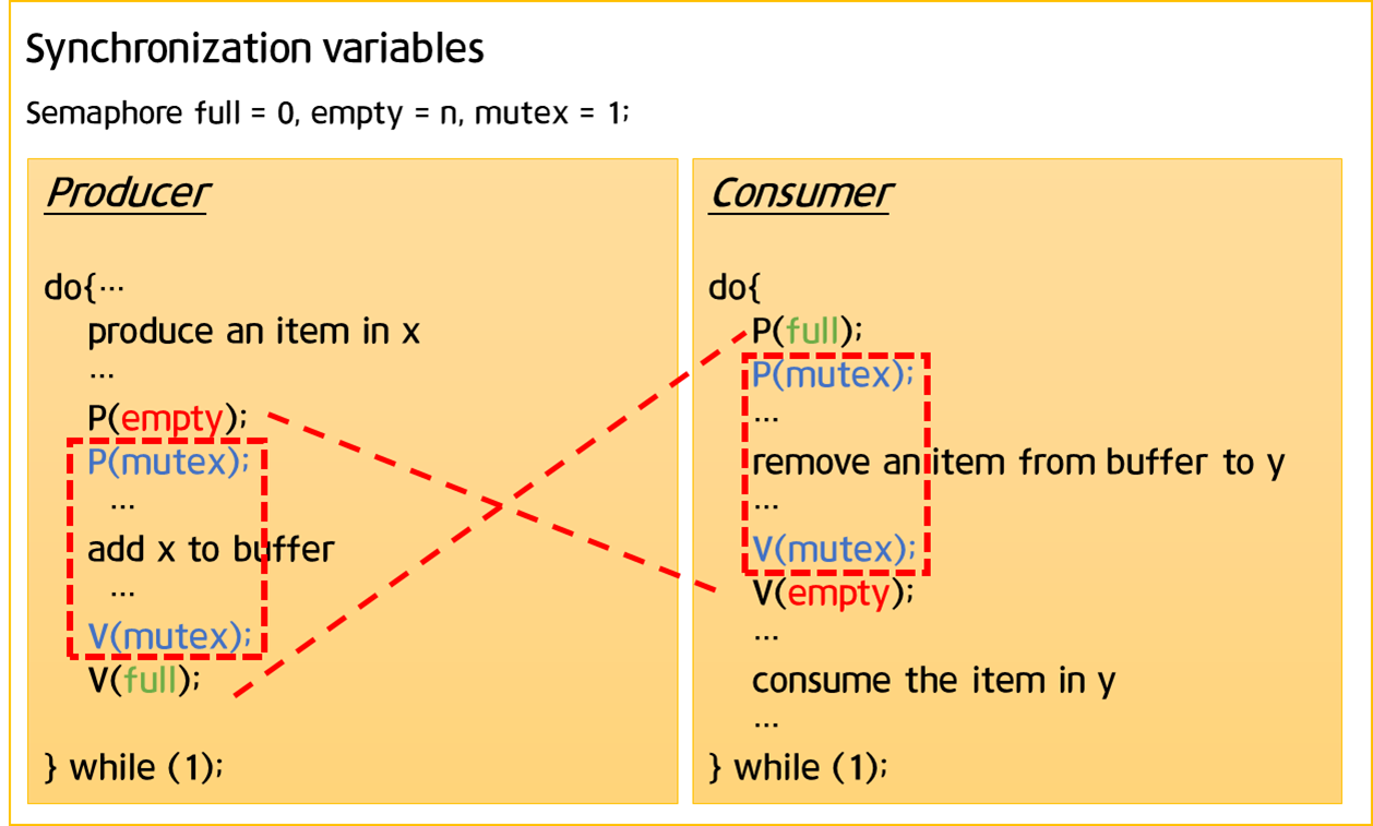 - mutual exclusion → Need binary semaphore(shared data의 mutual exclusion을 위해)