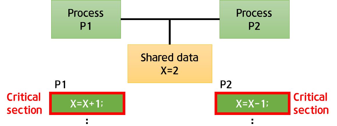 - 각 프로세스의 code segment에는 공유 데이터를 접근하는 코드인 critical section이 존재