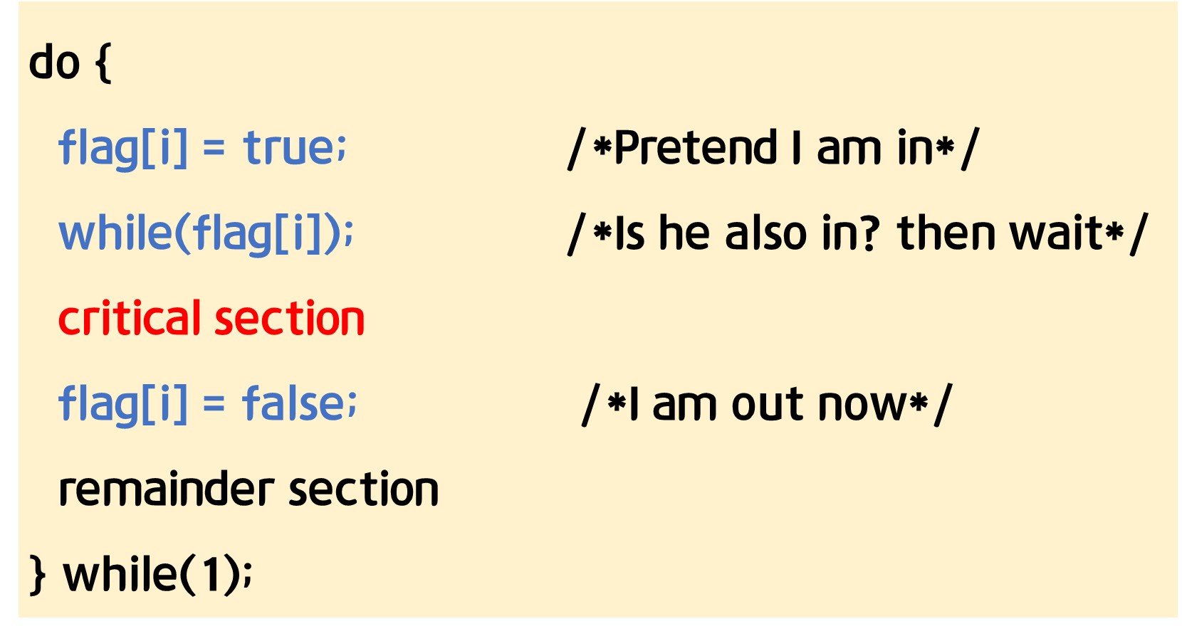 - Mutual Exclusion(상호 배제) 성립, But Progress(진행)를 만족하지 못함.