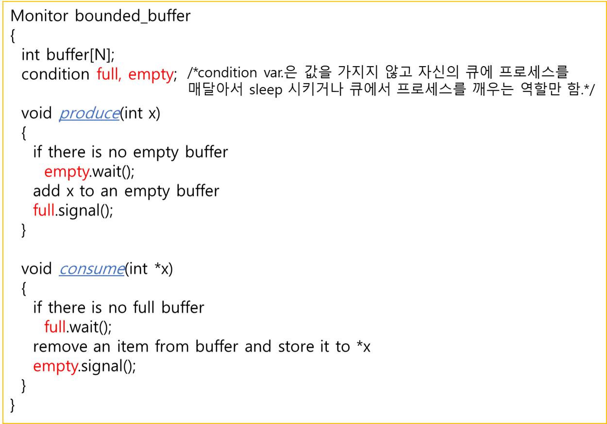 - 프로세스가 모니터 안에서 기다릴 수 있도록 하기위해 condition variable 사용