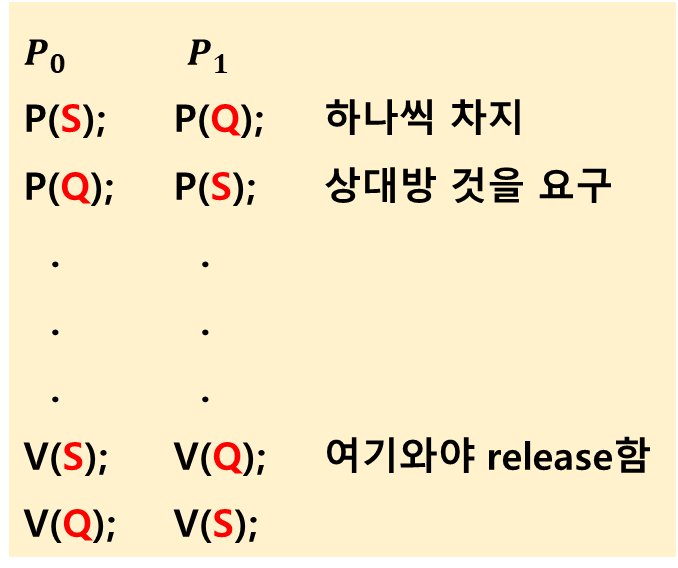 - Deadlock : 둘 이상의 프로세스가 서로 상대방에 의해 충족될 수 있는 event를 무한히 기다리는 현상