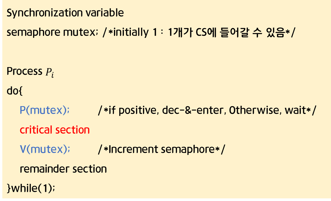 - 주로 mutual exclusion(lock/unlock)에 사용