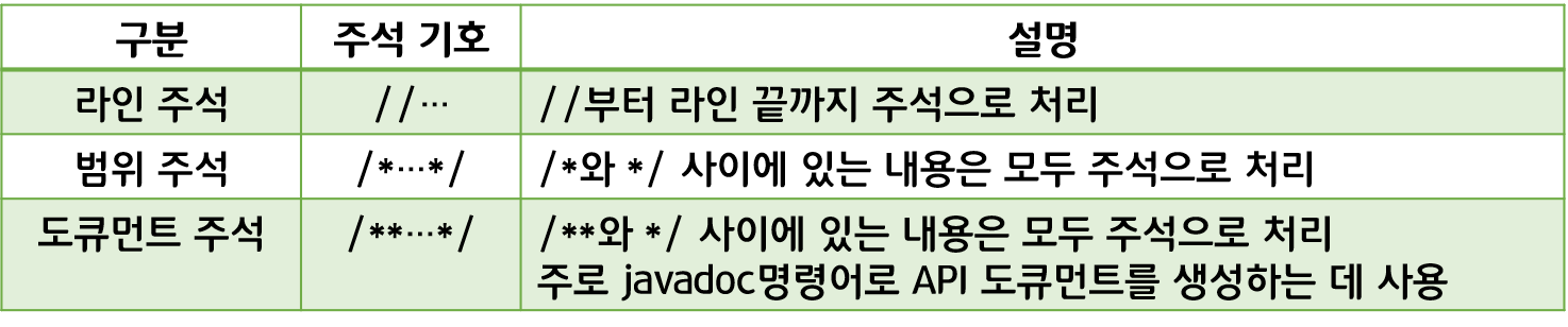 - 주석 : 프로그램 실행과는 상관없이 코드에 설명을 붙이는 것