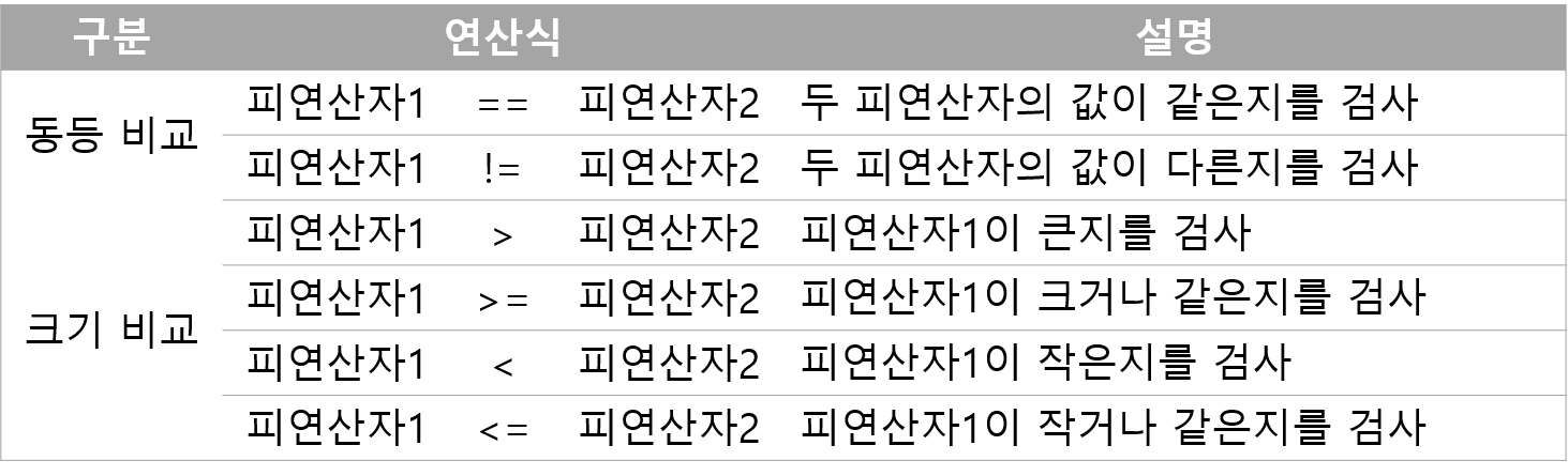 - 비교 연산자는 흐름 제어문인 조건문, 반복문에서 주로 이용되어 실행 흐름 제어
