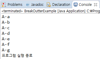 * 반복문이 중첩된 경우 가장 가까운 반복문만 종료 → 바깥쪽 반복문까지 종료시키려면 라벨(Label) 사용