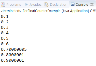 이유 : 0.1은 float타입으로 정확하게 표현할 수 없기 때문에 10번 반복으로 선언해도 9번만 돌게 됨.