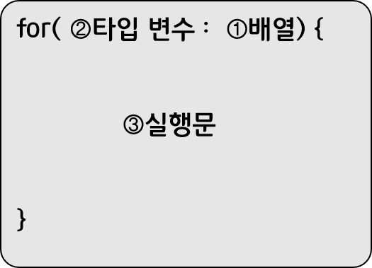 향상된 for문은 반복 실행을 하기 위해 카운터 변수와 증감식을 사용하지 않으며 배열에서 꺼낸 항목을 저장할 변수 선언과 콜론(:), 배열을 나란히 작성