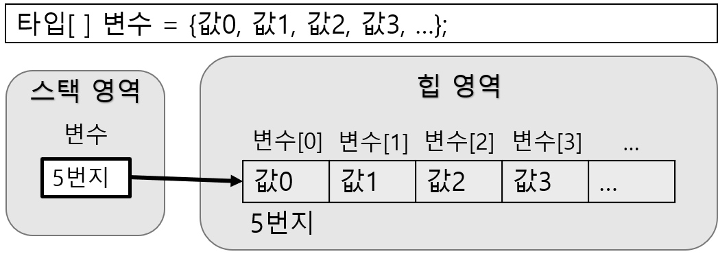 배열 변수는 참조 변수에 속하기 때문에 객체로 취급하므로 힙 영역에 생성되며 배열 변수는 힙 영역의 배열 객체를 참조한다.