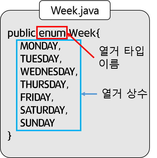 예를 들어, 월,화,수,목,금,토,일이라는 7개의 열거 상수가 있으면 이를 저장하는 일주일이라는 열거 타입이 있다.