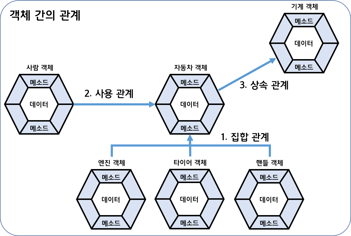 달린다, 멈춘다 등의 메소드를 호출하는 것으로 설명할 수 있다. - 상속 관계 : 상위(부모) 객체를 기반으로 하위(자식)객체를 생성하는 관계이다. 일반적으로 상위 객체는 종류를 의미하고 하위 객체는 구체적인 사물에 해당한다.