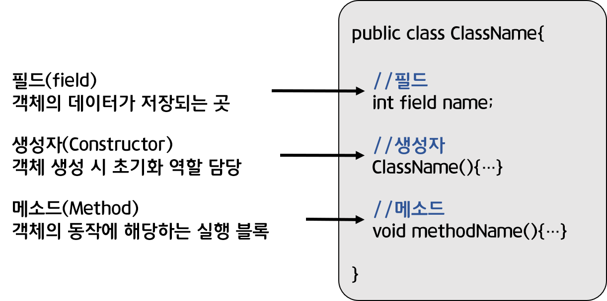 클래스에는 객체가 가져야 할 구성 멤버(필드, 생성자, 메소드)가 선언됨.