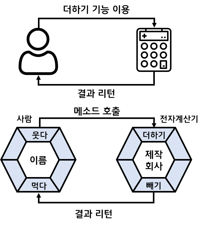 객체의 상호작용은 객체 간의 메소드 호출을 의미하며 매개값과 리턴값을 통해서 데이터를 주고 받는다.