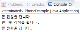 다음 PhoneExample클래스의 4라인은 Phone의 생성자를 호출해서 객체를 생성할 수 없음을 보여주며, 그 대신에 자식 클래스인 SmartPhone으로 객체를 생성해서 turnOn()메소드와 turnOff()메소드를 사용하는 예제이다.
