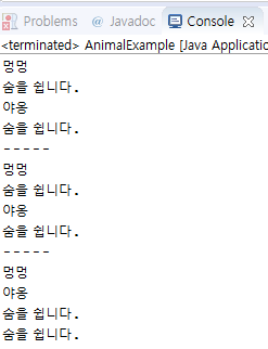- Animal 변수로 타입 변환해서 메소드를 호출. 자식은 부모 타입으로 자동 타입 변환이 될 수 있고, 메소드가 재정의되어 있을 경우 재정의된 자식 메소드가 호출되는 다형성의 특징이 그대로 적용됨.