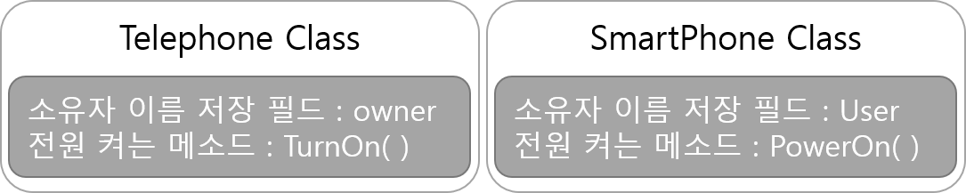 Telephone Class와 SmartPhone Class의 필드와 메소드는 같은 역할을 하지만 이름이 다르다. 다음과 같이 동작하는 기능와 사용하는 데이터가 모두 동일함에도 불구하고 이름이 다르다 보니, 객체마다 사용 방법이 달라지는 경우가 발생할 수 있다. 때문에 추상클래스의 메소드를 상속받음으로써 필드와 메소드 이름을 통일할 수 있다.