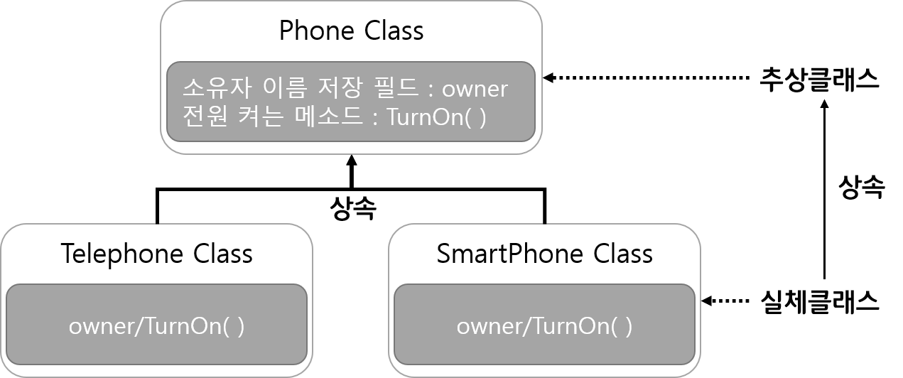 추상 클래스와 실체 클래스는 상속의 관계를 가지고 있으며, 추상 클래스가 부모, 실체 클래스가 자식으로 구현되어 실체 클래스는 추상 클래스의 모든 특성(필드, 메소드)을 물려받고, 추가적인 특성을 가질 수 있다.