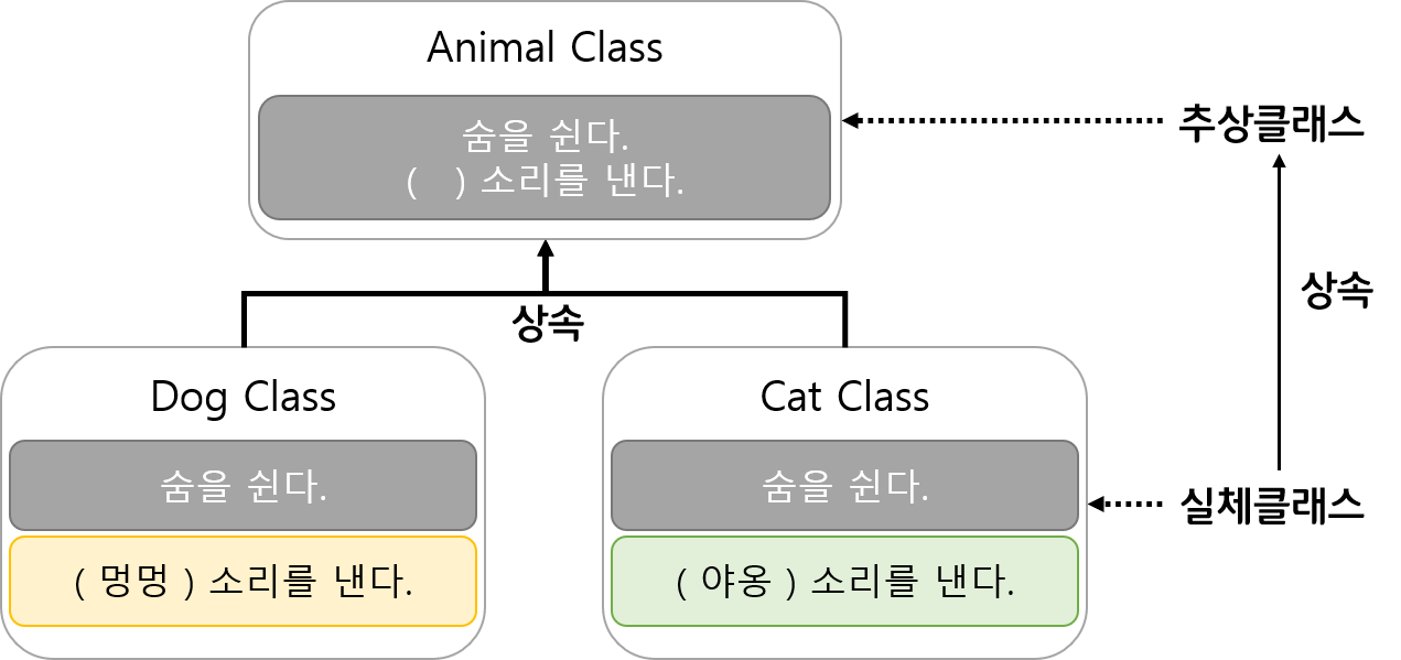 추상 메소드인 Animal Class에는 숨을 쉬는 것과 소리를 내는 메소드가 들어가야 하는데, 소리는 어떤 소리를 내는지 모르기 때문에 추상 메소드로 구현해야 한다.