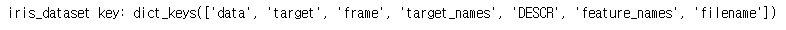 print(f"iris_dataset key: {iris_dataset.keys()}")