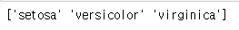 feature_names는 4개의 특징 값이 의미하는 바를 나타내며 꽃의 꽃받침 길이, 꽃받침 너비, 꽃잎 길이, 꽃잎 너비를 의미하는 것을 알 수 있다.