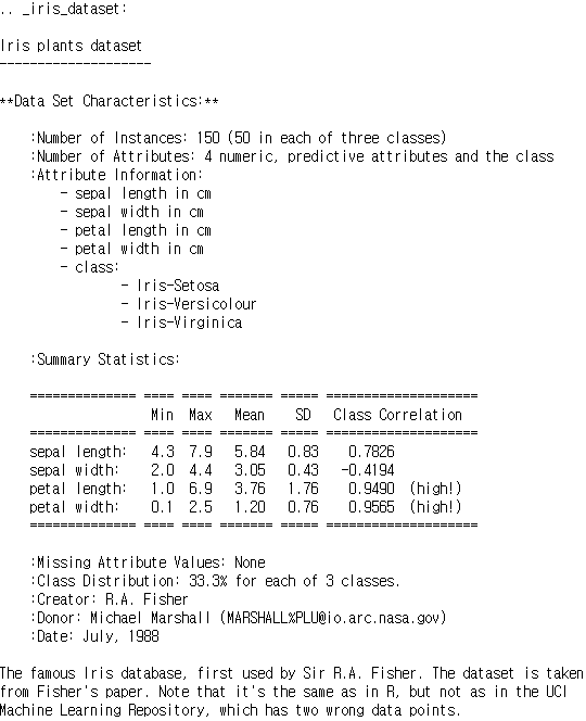 DESCR은 Description의 약자로서 해당 데이터에 대한 전체적인 요약 정보를 보여준다.