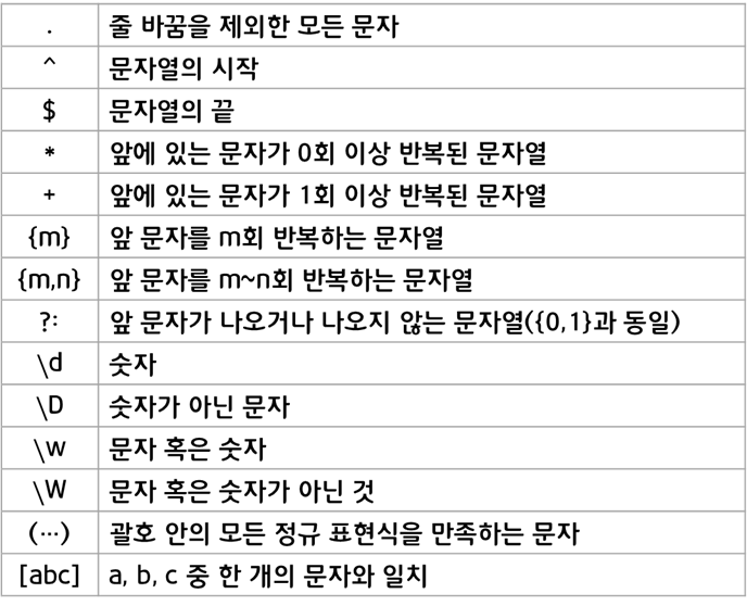 파이썬 정규 표현식에 사용하는 특별한 문자나 기호는 다음과 같다.