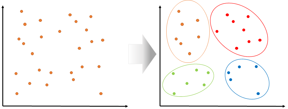 비지도학습은 지도학습과는 데이터에 대한 레이블이 존재하지 않기 때문에 데이터의 특성을 찾아내서 적당한 범주를 만들어 각 데이터를 나누며 학습한다.