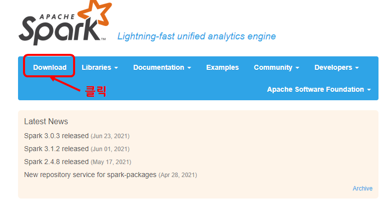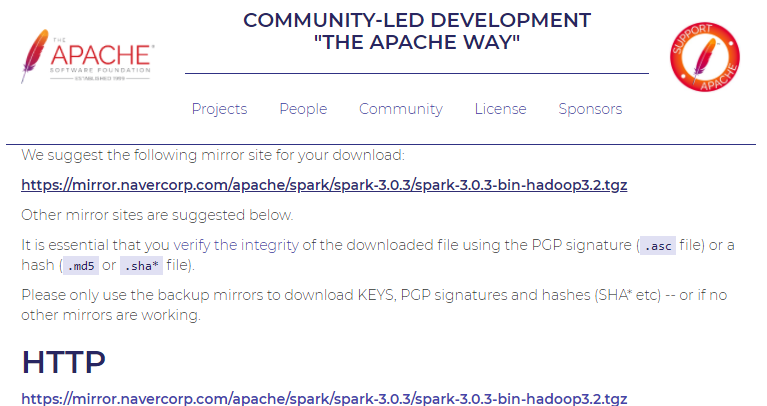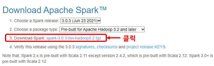 3. 원하는 버전과 패키지 타입 선택 (예시는 하둡 라이브러리를 포함하여 설치)