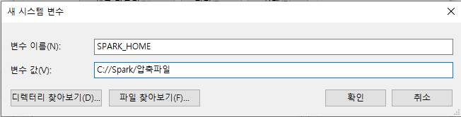 다음으로 시스템 변수 중 Path를 클릭하여 %SPARK_HOME%\bin과 %HADOOP_HOME%\bin 을 추가한다.