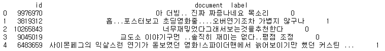 train_data = pd.read_csv(DATA_IN_PATH + 'ratings_train.txt', header = 0, delimiter = '\t', quoting = 3)